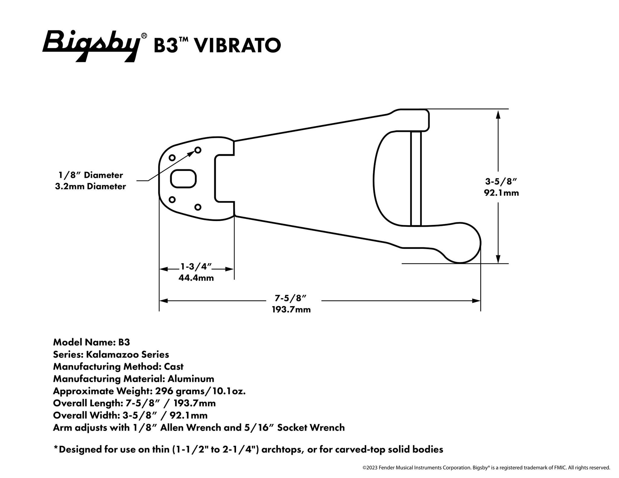 The B3 is commonly used with thin archtops to carved-top solidbodies including some Gretsch Duo Jet models. The lack of a tension bar creates a shallower break angle over the bridge for a softer string feel.