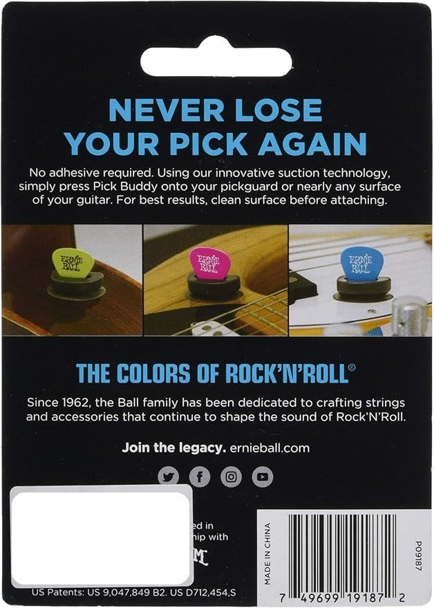 An adhesive-free compact thermoplastic holder that keeps your pick close at hand. Great for musicians who combine various finger-style plectrum techniques on bass or guitar. Using our innovative self-adhesive suction technology simply press Pick Buddy onto your pickguard or nearly any surface of your guitar for instant access to your pick. Never lose your pick again!
