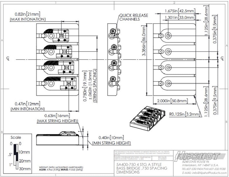 Hipshot style A Bass bridges are available in a wide variety of string spacing; in your choice of aluminum or brass. All style A bass bridges feature top load or thru the body stringing options.Type A saddles feature variable string spacing adjustment for even greater versatility and fine intonation adjustment as well.