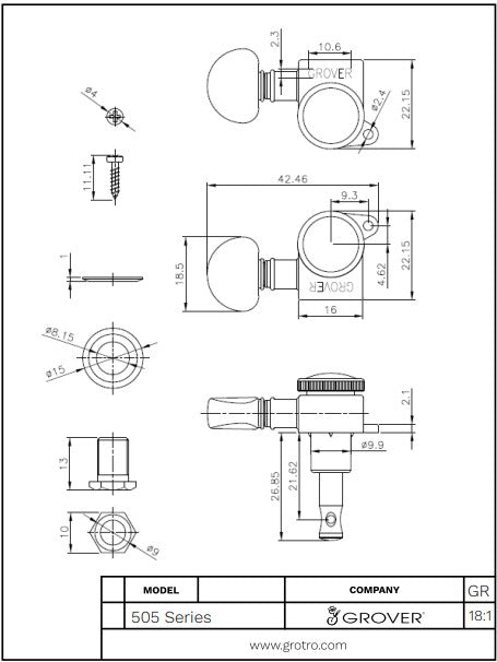• Sealed-in, lubricated gears • 18:1 gear ratio • 25/64” post hole • Post length to hole: 20.54mm • Overall post length: 25.6mm • Weight per pc/per set: 1.4oz / 8.4oz • Max. string gauge: .054” • Hardware included (bushings, washers, screws) • Drop-in replacement for: 205 Series 205-18 Series