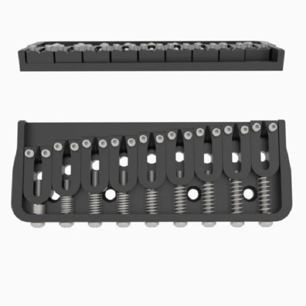 The Hipshot Fixed Bridge is the ultimate marriage of performance, beauty and ergonomics. Each bridge is hand polished for a smooth, comfortable feel under your palm. The stainless steel saddles have a crisp string relief edge, eliminating dull tones. The side walls lock your saddles in place no matter how hard you thrash.